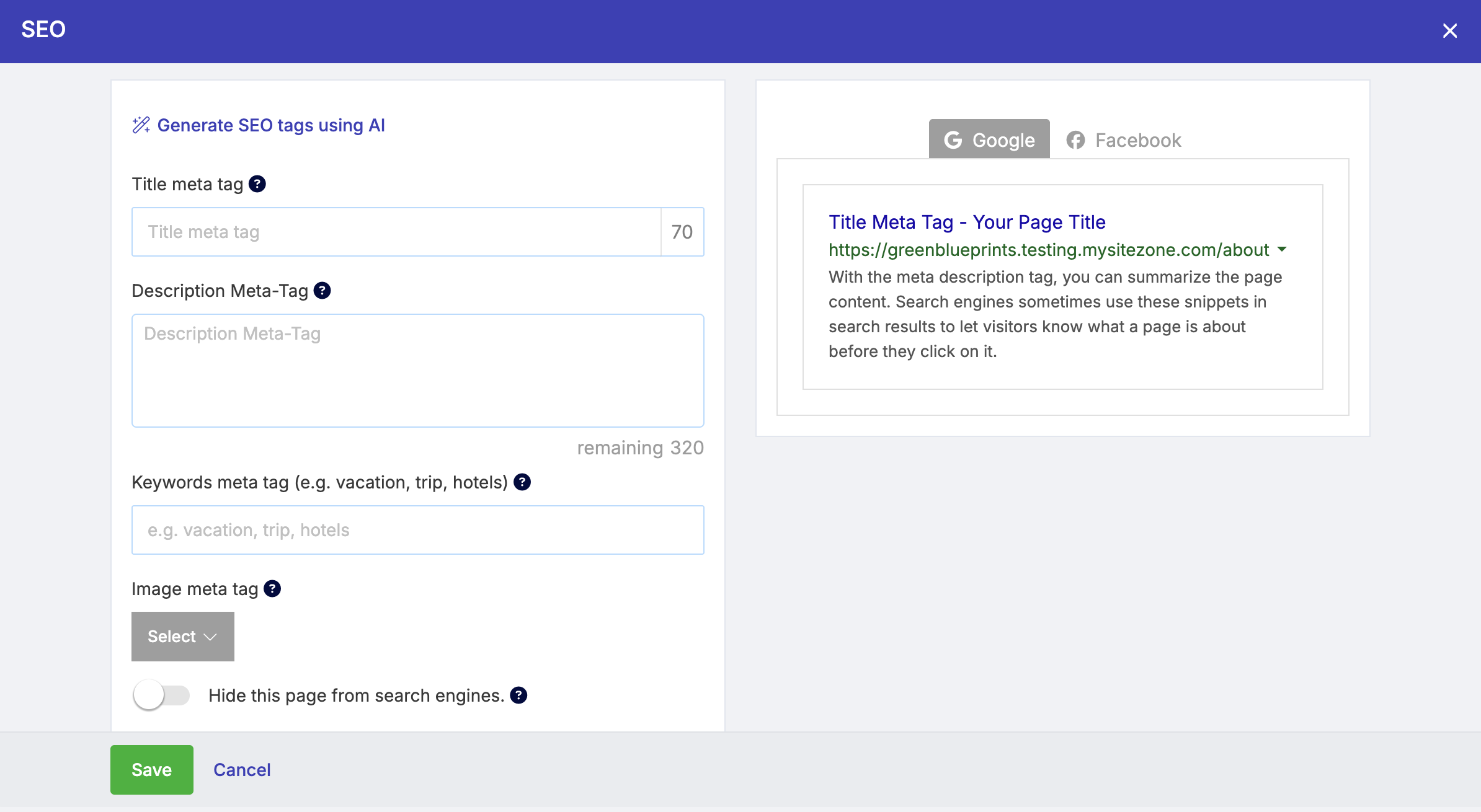 Dieses Tool hilft Ihnen, das SEO Ihrer Seiten effizient anzupassen und zu optimieren, wodurch Sichtbarkeit und Reichweite Ihrer Website steigen. Um es zu nutzen, klicken Sie oben im Fenster Ihrer SEO-Einstellungen auf die Option SEO-Tags mit AI generieren.